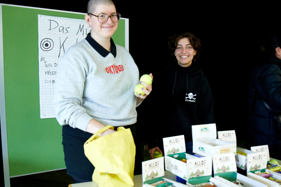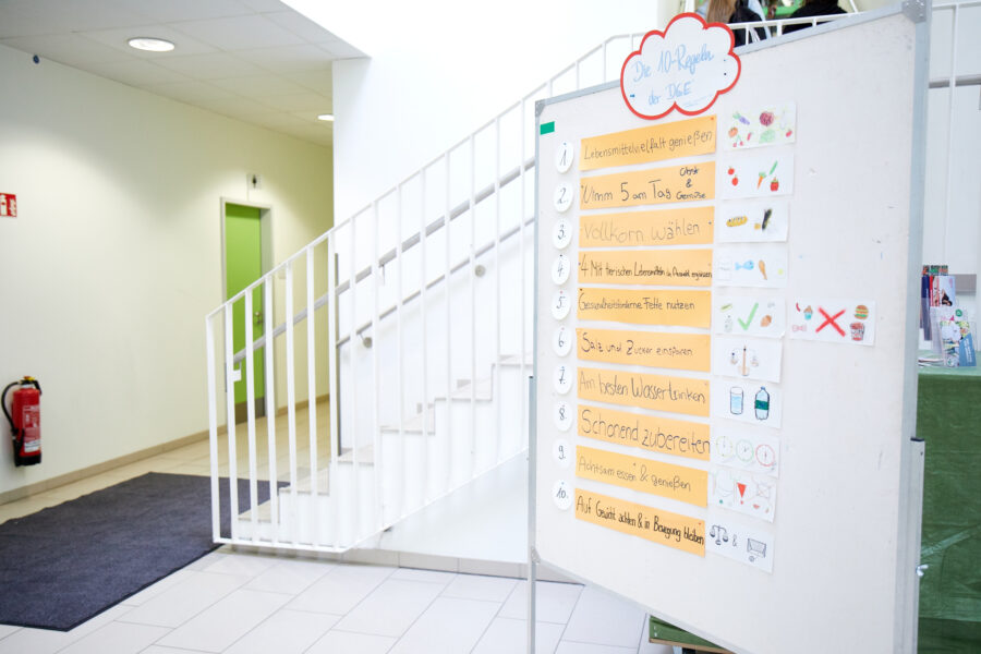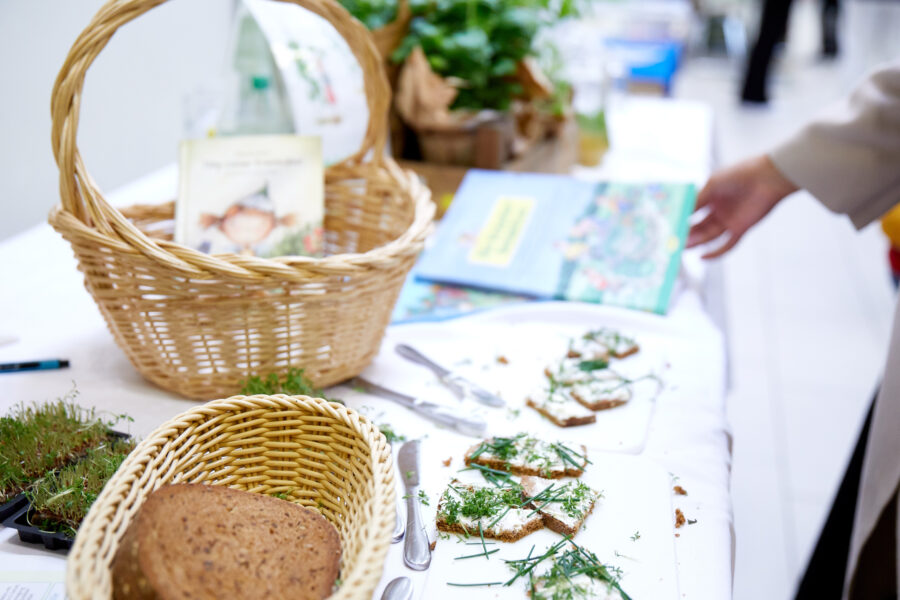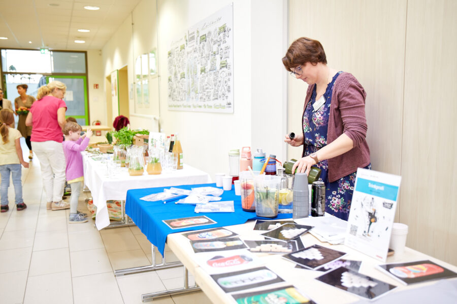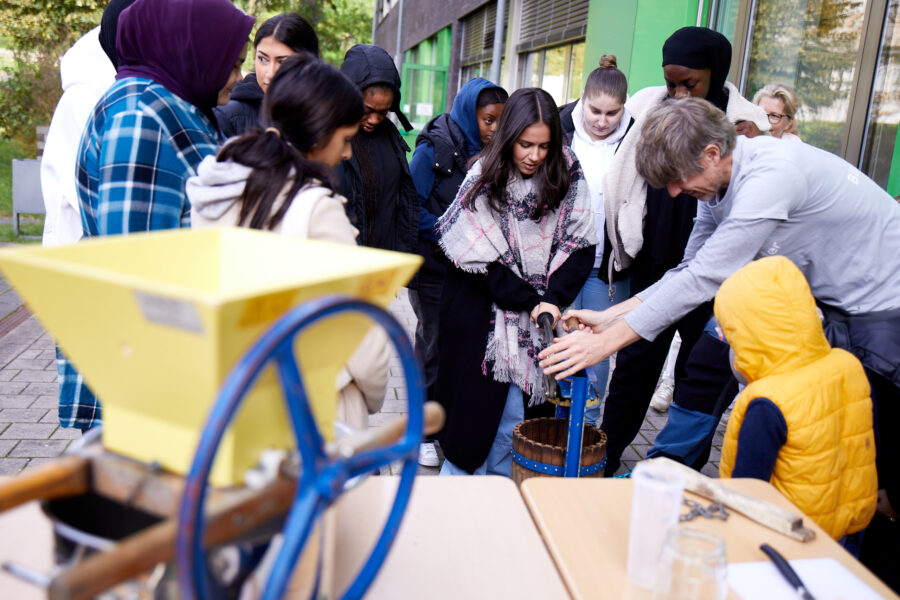 Auf dem Programm standen neben Workshops zu den Themen Trinkwasser, den Auswirkungen von Ernährung auf den Klimawandel, Fleischkonsum, Zusammenhängen von Ernährung und Klimakrise und den Auswirkungen von Bio-Lebensmitteln auf Gesundheit und Klima auch Mitmach-Aktionen, wie das Pressen von Apfelsaft aus den ersten eigenen Äpfeln von Bäumen, die im Dezember 2022 auf dem Schulgelände gepflanzt wurden und Fallobst einer Streuobstwiese, der Erkundung von Zuckern in Getränken, und der richtigen Aufbewahrung von Lebensmitteln im Kühlschrank. Dazu gab es am vom RUK-Team gebauten Glücksrad und einem “Kalorien-Katapult” gesunde Snacks und nachhaltige Gegenstände zu gewinnen. Besonderes Highlight war ein Stand mit Spielen, Infos und Kostproben zum Thema “Alles rund um die Kräuter” der von vier Vorschulkindern und der stellvertretenden Leitung der Praxisaussbildungsstätte (PAS) kompetent betreut wurde.