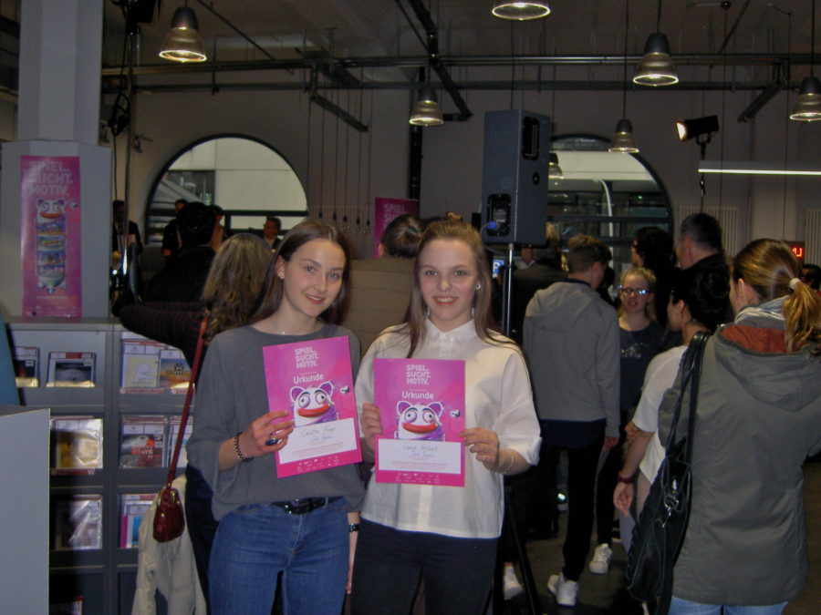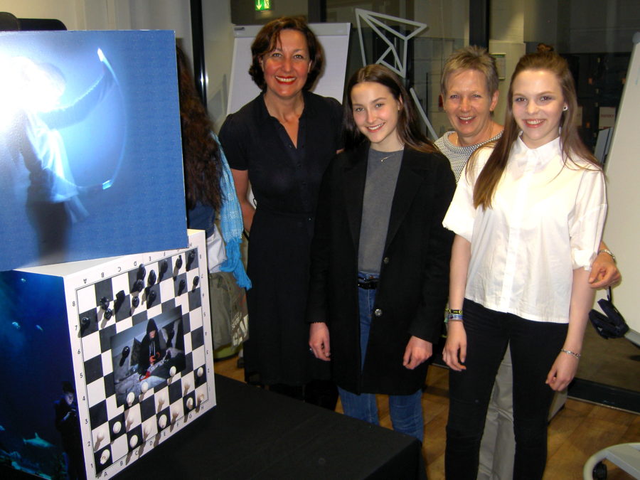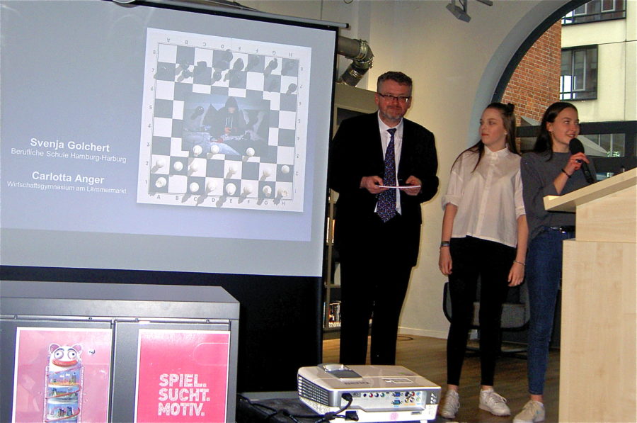Ausgezeichnet wurde auch eine Schülerin des Beruflichen Gymnasiums Harburg. Unter großem Applaus nahmen Svenja, zusammen mit ihrer Freundin Carlotta, ihre Urkunden entgegen. Zur Idee des Motivs erläuterten sie dem Publikum, dass sie die Frage „Ist das Leben ein Spiel oder das Spiel ihr Leben?“ thematisch mittels eines Schachbrettes in Szene gesetzt haben.